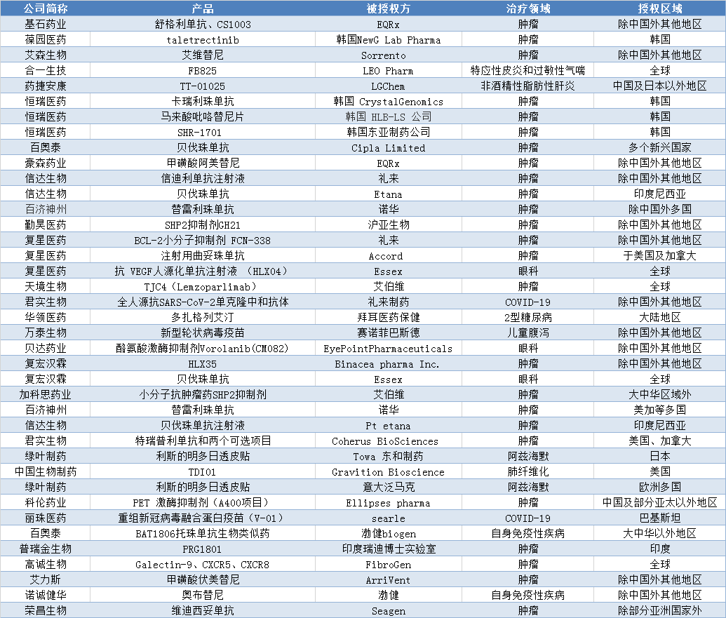 授权对象更加丰富。过去,国内创新企业License out的合作对象大多为跨国药企,如阿斯利康、默克集团、礼来制药、默沙东等。但2020年以来,越来越多的区域性药企成为新的合作对象,如意大泛马克、美国初创药企EQRx等等。