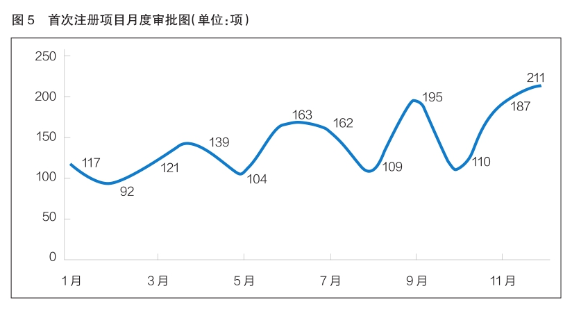 其中,首次注册1710项,与2020年相比增加8.8%。延续注册6939项,与2020年相比增加25.6%。变更注册2665项,与2020年相比减少3.1%。