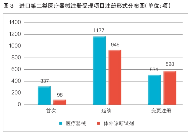 从注册形式来看,首次注册281项,占全部进口第二类医疗器械注册数量的7.7%;延续注册2420项,占全部进口第二类医疗器械注册数量的66.3%;许可事项变更注册948项,占全部进口第二类医疗器械注册数量的26%。