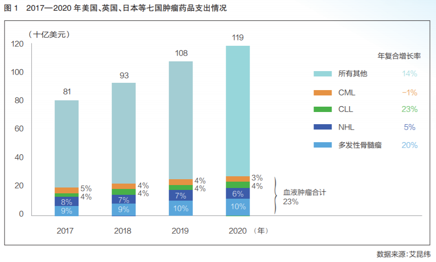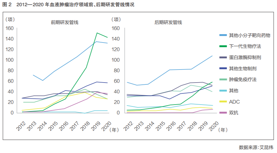血液肿瘤的疾病特征和治疗手段与实体瘤不同。目前,尽管如淋巴瘤、白血病和骨髓瘤等常见的血液肿瘤在癌症新发病例中的比例不高,但在儿童癌症中这一比例正在逐渐上升,已接近40%。此外,就全球范围而言,血液肿瘤疾病负担沉重,存在巨大未被满足的临床需求,因此血液肿瘤治疗成为创新热点,许多突破性技术不断涌现。 血液肿瘤分型分类复杂 靶向治疗模式带来更多选择 在过去几十年中,靶向治疗与化学疗法、放射疗法和其他医疗手术(如干细胞移植)共同为提高患者生存率发挥了重要作用。 急性淋巴细胞白血病(ALL) 在0~19岁的人群中,白血病是发病率较高的血液系统恶性肿瘤,其中ALL是最常见的类型,占74%。但在20岁以上的成年人中,ALL发病率较低。 基因检测在ALL诊断中意义重大,是明确疾病亚型和选择治疗方案的关键手段。化疗和干细胞移植仍然是ALL主要的治疗选择。过去三年,靶向CD19和CD3的双特异性抗体(BiTEs)博纳吐单抗在ALL疗法支出中的份额不断增加,该药能够延长晚期ALL患者的生存期。靶向BCRABL的一、二、三代酪氨酸激酶抑制剂(TKI)可作为患者病情进展或获得耐药性时的替代治疗。ALL患者受益于一系列靶向疗法,例如CAR-T、单克隆抗体、TKI和BiTEs,但是对于不适用靶向治疗的患者,其改善预后的需求尚未得到满足。 慢性淋巴细胞白血病(CLL) 在20岁以上的成年人中,CLL是最常见的白血病类型,占白血病的38%。CLL也是五年生存率最高的亚型,生存率达到86%。如果CLL没有进一步发展或引起症状,则只需监测不用进行治疗。具有del(17p)或TP53突变的CLL患者可选择靶向治疗,这类患者在以往的治疗中具有较差的预后。 艾昆纬数据显示,新型靶向疗法如布鲁顿氏酪氨酸激酶(BTK)抑制剂,占据2020年CLL治疗药物市场的75%,其中依鲁替尼所占份额位居第一。BCL-2拮抗剂Venclexta(Venetoclax)用于治疗复发/难治性CLL,占2020年CLL治疗药物市场的12%。抗CD20利妥昔单抗由于专利到期,在CLL治疗领域的销售额下滑。 急性髓系白血病(AML) AML是0~19岁人群和20岁以上人群中均为第二常见的白血病类型,且占20岁以上成人白血病的31%。吸烟会增加罹患AML的风险。四种常见白血病(ALL、CLL、AML、慢性髓系白血病)中,AML是五年生存率最低的。 FLT3和BCR-ABL是AML重要的生物标志物,用于细分患者类型以指导治疗决策。艾昆纬数据显示,2020年,FLT3抑制剂占AML药品市场总额的22%,位居前列的是二代FLT3抑制剂吉瑞替尼。阿扎胞苷、阿糖胞苷、柔红霉素和伊达比星是用于治疗AML的常见细胞毒性药物。2020年,细胞毒性药物仍占AML药品市场总额的40%。 慢性髓系白血病(CML) 针对BCR-ABL(费城染色体)阳性CML的首个TKI的获批上市,彻底改变了CML的治疗格局。伊马替尼(商品名为格列卫)是第一个肿瘤靶向治疗药物,于2001年首次获得美国食品药品管理局(FDA)批准。目前CML领域药品支出几乎都来自靶向BCR-ABL的TKI,新一代TKI为出现耐药突变的患者提供了新的治疗选择。 值得一提的是,2019年国家药监局批准了甲磺酸氟马替尼(商品名为豪森昕福)的上市注册申请,用于治疗费城染色体阳性的慢性髓性白血病(Ph+CML)慢性期成人患者。该药是我国拥有自主知识产权的创新药,通过优先审评审批程序获批上市。甲磺酸氟马替尼为小分子蛋白酪氨酸激酶(PTK)抑制剂,通过抑制Bcr-Abl酪氨酸激酶活性,抑制费城染色体阳性的CML和部分急性淋巴细胞性白血病患者的瘤细胞增殖,诱导肿瘤细胞凋亡。该药的上市为我国Ph+CML慢性期成人患者提供了新的用药选择。 非霍奇金淋巴瘤(NHL) NHL是最常见的一种淋巴瘤。艾昆纬数据显示,2020年该病全球五年患病率为每10万人中有19.8例。根据WHO数据,NHL包含60多个亚型,可根据累及细胞的类型以及淋巴瘤是侵袭性还是惰性来划分亚型。弥漫性大B细胞淋巴瘤(DLBCL)和滤泡性淋巴瘤(FL)分别是最常见的侵袭性NHL和惰性NHL。NHL常用的治疗方案有化疗、放疗和干细胞移植,也可以采用靶向治疗。 从药品销售额来看,抗CD20单克隆抗体利妥昔单抗和生物类似物仍然是NHL领域主要的药品支出。艾昆纬数据显示,2020年,BTK抑制剂依鲁替尼在NHL药品支出中占据23%的份额。 霍奇金淋巴瘤(HL) HL是一种比较少见的血液肿瘤,在白血病、淋巴瘤、骨髓瘤中,HL的五年生存率最高,为88.3%。HL有两种亚型,一种是经典型,占比95%;另一种是以结节性淋巴细胞为主型的HL,占比5%。这两种亚型HL治疗方案基本一致。广泛用于实体瘤治疗的PD-1抑制剂仅适用于特定类型的HL,其中应用较多的是纳武单抗和帕博利珠单抗。 对创新疗法的探索研究 造血干细胞移植 靶向疗法(激酶抑制剂) 细胞疗法 其他技术 相关药物市场及研发布局情况