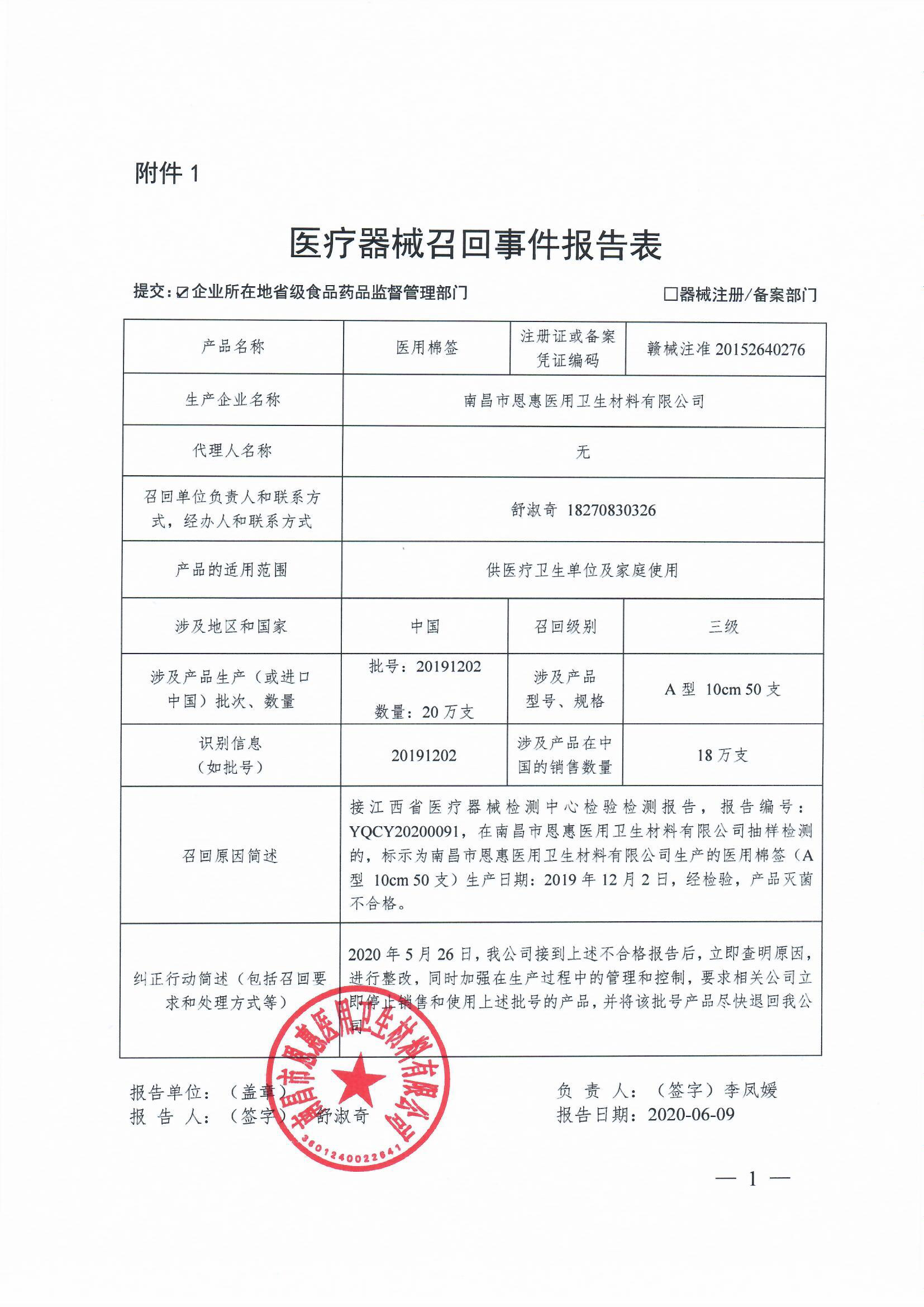 南昌市恩惠医用卫生材料有限公司对医用棉签主动召回