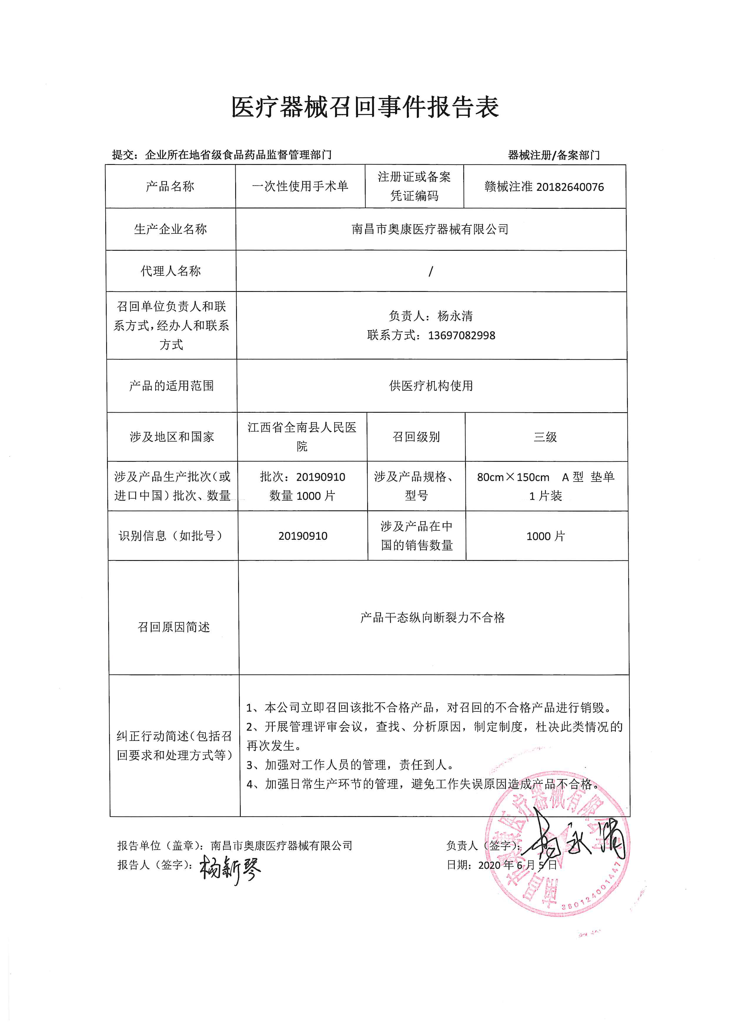 南昌市奥康医疗器械有限公司报告,由于一次性使用手术单干态纵向断裂强力不符合标准要求,南昌市奥康医疗器械有限公司对其生产的一次性使用手术单(注册证号:赣械注准20182640076)主动召回。召回级别为三级。涉及产品的型号、规格及批次等详细信息见《医疗器械召回事件报告表》。