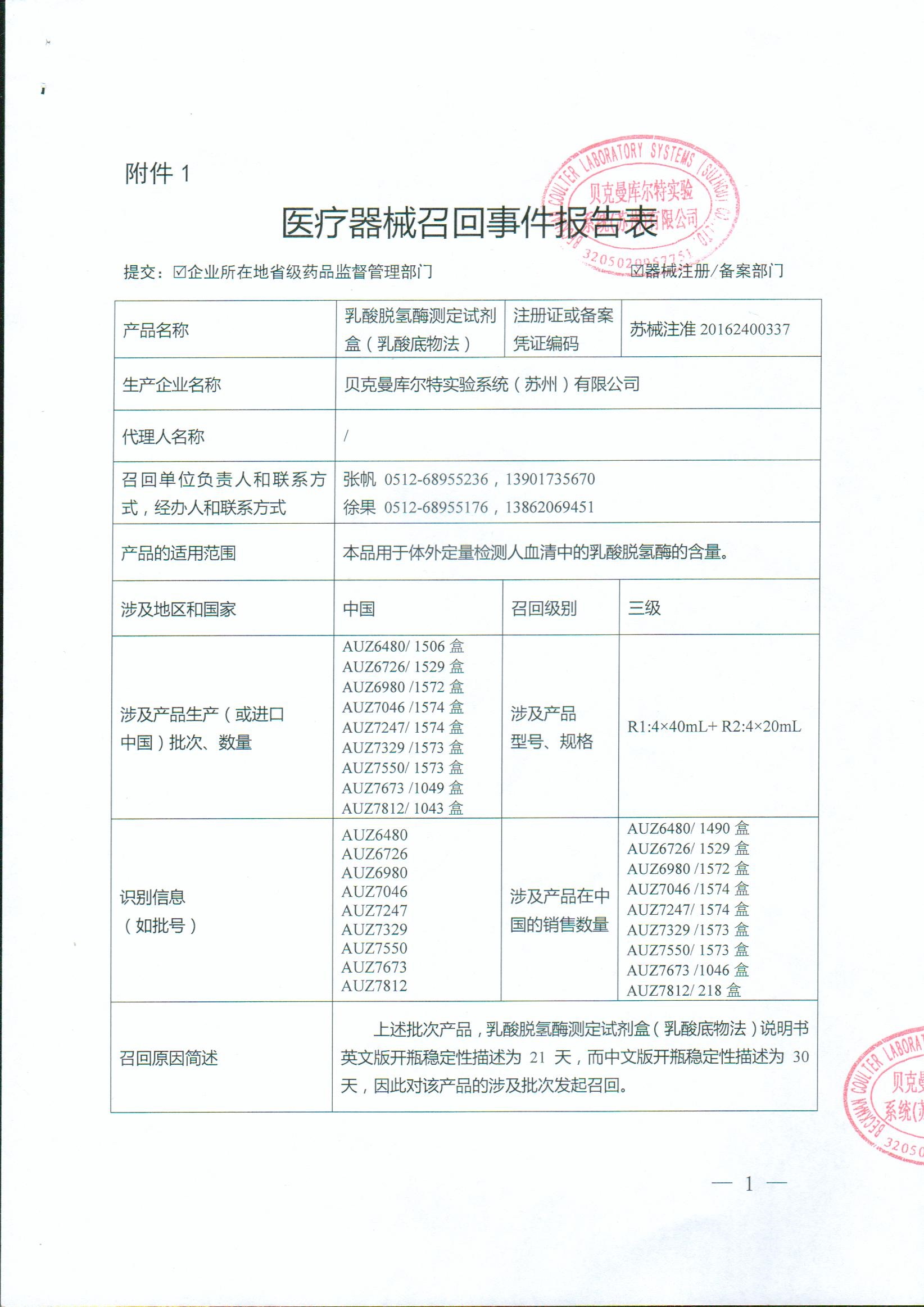贝克曼库尔特实验系统(苏州)有限公司对乳酸脱氢酶测定试剂盒(乳酸底物法)主动召回
