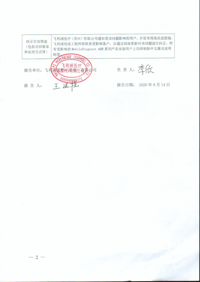 飞利浦医疗(苏州)有限公司对移动式数字化医用X射线摄影系统主动召回