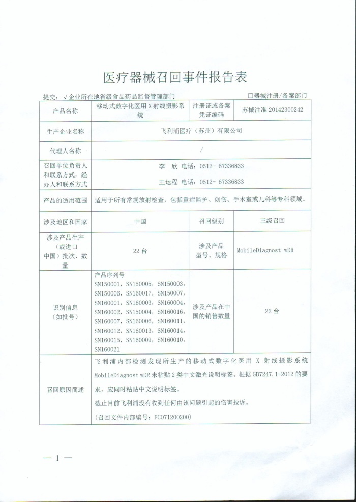 飞利浦医疗(苏州)有限公司报告,该企业在内部检测中发现其生产的移动式数字化医用x射线摄影系统(产品型号:MobileDiagnost wDR)未粘贴2类中文激光说明标签,现主动召回,召回级别为三级。涉及 产品的具体信息见《医疗器械召回事件报告表》