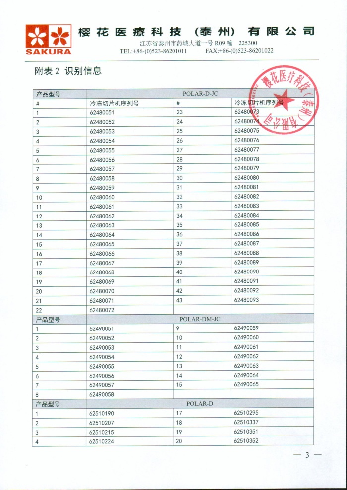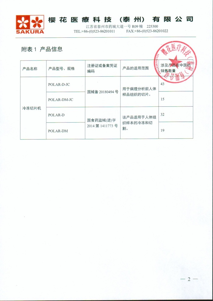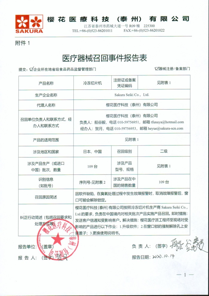 樱花医疗科技(泰州)有限公司对冷冻切片机主动召回